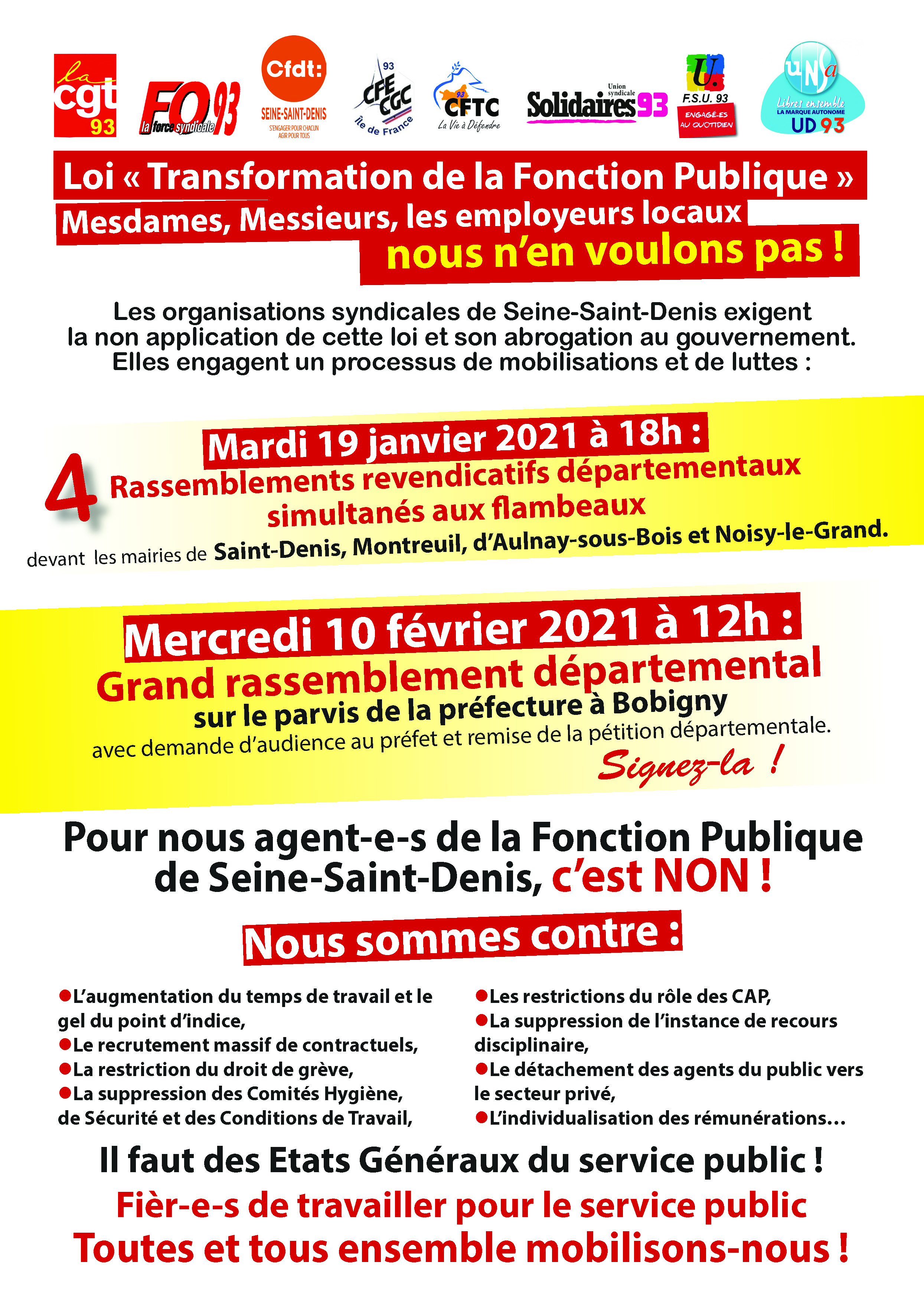 L'intersyndicale réaffirme son opposition à la loi de transformation de la Fonction Publique et appelle à des rassemblements revendicatifs départementaux simultanés le MARDI 19 JANVIER 2021 à 18H devant les Mairies de Noisy Le Grand, Montreuil, Saint-Denis et Aulnay-Sous-Bois.