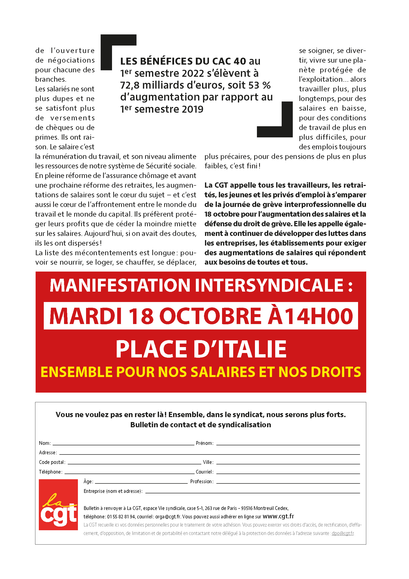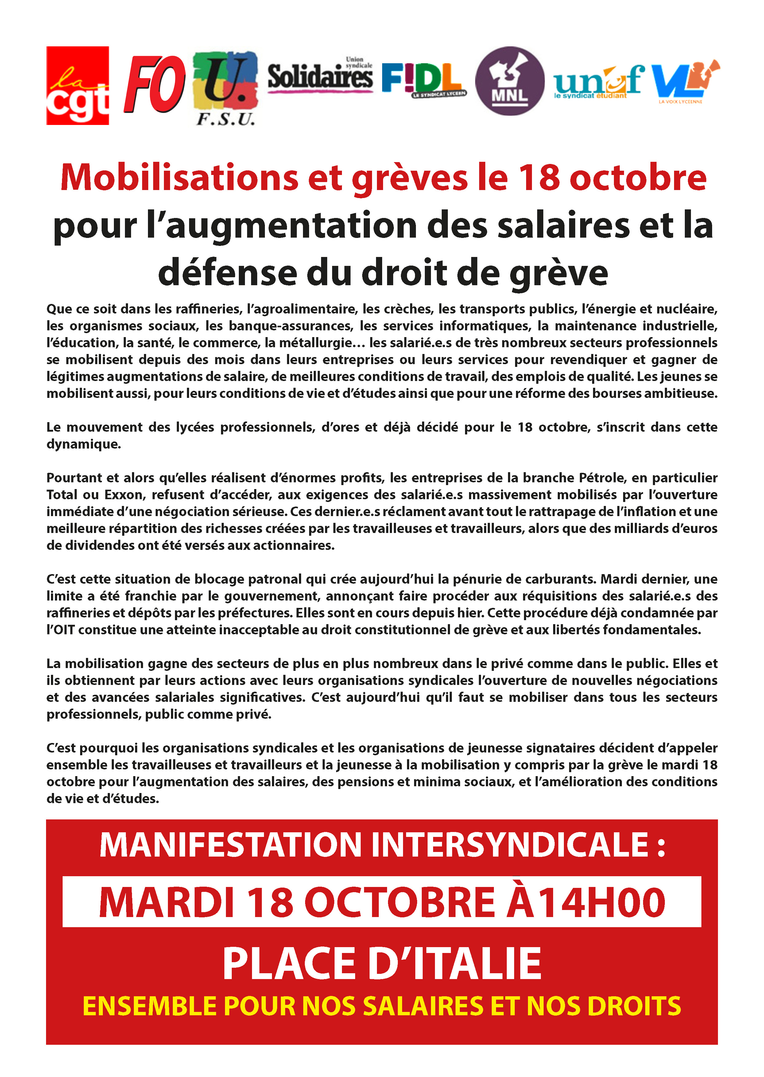 C’est pourquoi les organisations syndicales et les organisations de jeunesse signataires décident d’appeler ensemble les travailleuses et travailleurs et la jeunesse à la mobilisation y compris par la grève le mardi 18 octobre pour l’augmentation des salaires, des pensions et minima sociaux, et l’amélioration des conditions de vie et d’études.